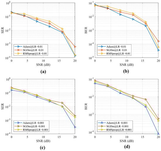 Figure 11 shows the analysis of SER and BER of the proposed CNN-GRU model by changing different model parameters during the training of the model. The changing parameters are considered three well-known optimization algorithms, namely, Adam, SGDm, and RMSprop. In addition, to conform to the model learning rate (LR), we have configured the training parameters by considering the LR of and , respectively. Figure 11a,b indicate that the simulation results are taken under the LR of and three optimization algorithms. In Figure 11a, with the same LR, the Adam optimizer shows better SER performance than the others with different SNR values, and among SDGm and RMSprop, RMSprop achieves a better SER performance than SGDm. A similar performance happens for BER of Figure 11b. On the other hand, the simulation results of SER and BER with LR of and three optimizers are shown in Figure 11c,d. Figure 11c,d indicate that with LR of , the SER and BER performance of the proposed CNN-GRU model is less than LR . Furthermore, the Adam optimizer shows a better performance compared to the others. It is indicated that in the lower SNR part, the three optimization algorithms show similar performance and follow the same trend, which confirms the proposed model robustness with three optimization algorithms.