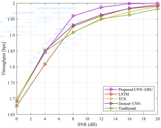 Figure 12 shows the throughput analysis comparison of the proposed CNN-GRU with the traditional method, Demod-CNN model, TCN, and LSTM model regarding different SNR values. The graph demonstrates that the suggested model performs almost as well as other approaches in the SNR regions of (0–5) dB. At the initial values of the SNR, the achievable rate of the CNN-GRU is bps, which is similar to the other methods and is bps with 5 dB SNR. After 5 dB SNR, the proposed CNN-GRU outperforms the other methods, and it achieves the maximum rate at a 20 dB SNR value. Thus, the proposed model exhibits the robustness of handling optimal prediction rates in different SNR ranges.