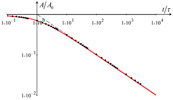 (Color online). Soliton amplitude’s dependence on normalized time () for Reynolds dissipation. Solid line—theoretical dependence (62); dots—numerical data; dashed line—asymptotic dependence .