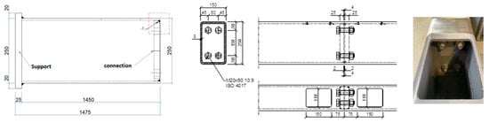 Each tested specimen implied two assemblies connected in the middle of the span. The rectangular specimens considered the RHS250 × 150 × 8 profile, with the details of the specimen presented in