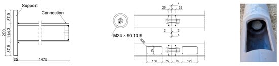 Each element assembly had a cut of 150 mm long and a width of 110 mm and 74 mm for the RHS and CHS specimens, respectively. The RHS was connected using four M20 gr. 10.9 bolts, while the CHS was connected by one M24 gr. 10.9 bolt. The torque wrench was set to introduce a 130 kN preload force.