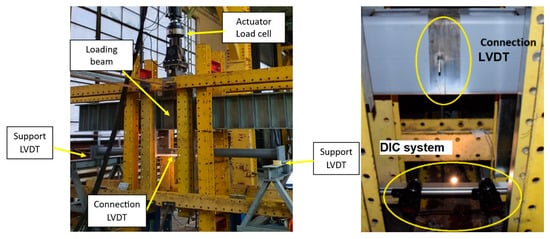 Nevertheless, with a reduced lever arm of the bolts to resist the bending deformation of the joint, the capacity of the connection is limited. Experimental tests were conducted on two similar specimens for an RHS of 250 × 150 × 8 with an end plate of 25 mm and four bolts M20 gr. 10.9 and two specimens for a CHS of 114.3 × 10 with an end plate of 25 mm and one bolt M24 gr. 10.9. The two tests lead to similar results showing trustful results. By applying two symmetrical forces with respect to the connection, pure bending was the only internal force in the connection. The tested specimen was monitored by linear displacement transducers to obtain the midspan deflection while the force was monitored by the actuator loadcell. To record the joint separation, the digital image correlation technique was employed. Tensile tests were also performed to obtain the real mechanical properties of the base material of the RHS, CHS, and bolt.