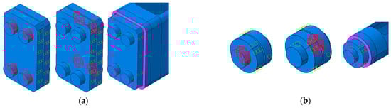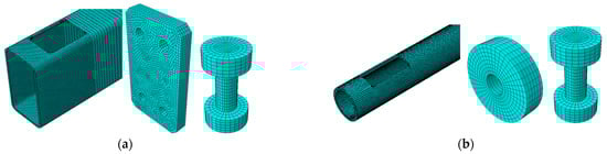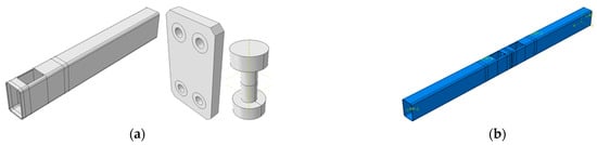 Each part was meshed with C3D8R (an 8-node linear brick, reduced integration, hourglass control) finite element type. The size of the element was approximately 5 mm, with smaller elements being defined for the bolts, allowing 2 elements on the thickness of the hollow element wall (