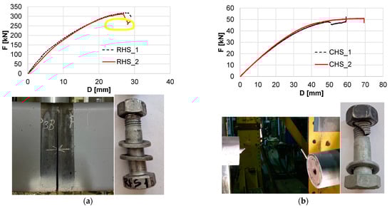 Figure 16. Of course, the capacity of the RHS is bigger than the capacity of the CHS as well as the rigidity. It must be mentioned that the observed failure mode for both sections was bolt failure but the RHS specimen showed a redundant behavior due to the number of bolts, while the CHS specimen had a brittle failure mode, after the shank fracture the entire assembly could not resist any force. The failure mode of the bolts used in the RHS connection is the thread stripping while for the CHS connection is the shank fracture, as presented in