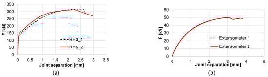 Figure 16. Both typologies failed by bolt fracture but the RHS, due to the multitude of bolts, experienced a safer collapse of the connection while the CHS profiles, connected by one bolt, completely detached from the connection. Force displacement curves were obtained from the acquisition system and joint separation was measured by the virtual extensometers of the DIC system.