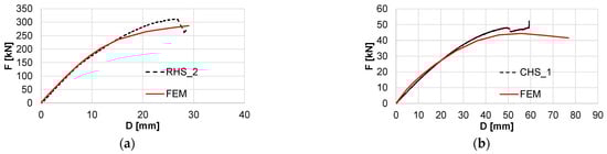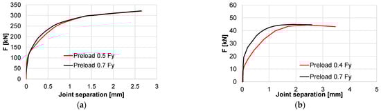 Figure 18). By comparing the joint separation recorded by the DIC system to the FEM model, the RHS specimens also showed a good agreement, with minor separation until 35% of the maximum force, while, experimentally, the CHS connection started separating immediately after load application although numerically, the preload limited the separation until 20% of the maximum force applied.
