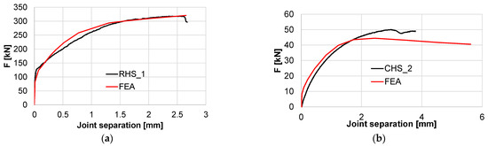 For the RHS, the joint separation obtained by the FEA closely follows the recordings during the experiment, especially the first stage of the experiment where the two profiles are kept in contact. The CHS connection response obtained from the FEA is similar to the RHS analysis, showing an initial stage where the profiles are in contact, a phenomenon that was not observed in the experiment of CHS.