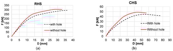 Figure 21). Of course, the decreased rigidity due to an access hole was the proportion of the missing material in the position of maximum bending moment. For the maximum force applied, an increase of 9% resulted for the CHS while the RHS had a similar capacity.
