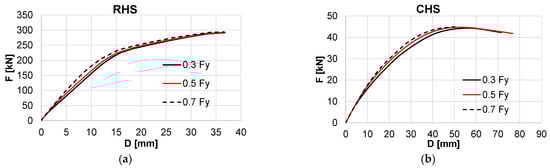 Bolt preload is required to have contact between profiles and perfect alignment at the time of assembling the structure. The RHS connection allows several bolts to be used while the CHS connections, which are usually of smaller sections, allow the use of one bolt. By considering different levels of preload, 0.3 ×, 0.5 ×, and 0.7 × Fy, where Fy is the nominal grade 10.9 yield force, the effect of the bolt preload was studied. A slightly significant increase of rigidity was observed for the RHS connection with the bolt preloaded at 200 kN, while for the other cases, the change of rigidity is neglectable,