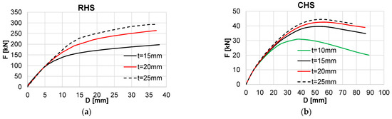 Similarly, the rigidity of the connection starts to decrease after 50% of the maximum force. Due to the singular bolt of the CHS connection, the curve shows an increased softening with the smaller thickness.
