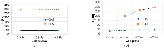 For the three levels of preload, 0.3, 0.5, and 0.7 of the nominal yield force of the bolts used in the connection, M20 gr 10.9 and M24 gr 10.9, for the RHS and CHS, respectively, the flexibility of the end plate for RHS led to a neglectable influence on both rigidity and capacity of the connection, but the joint separation was reduced for the CHS, which has a more rigid end plate compared to the area of the cross-section of the hollow section (