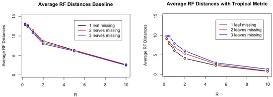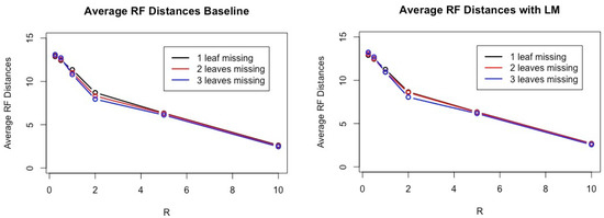 If we have only one missing leaf and larger R, often the average Robinson–Foulds distances between inferred trees and true trees is less than 1 because we have often the condition satisfied in Theorem 2 due to very high constraints on tree topologies of gene trees.