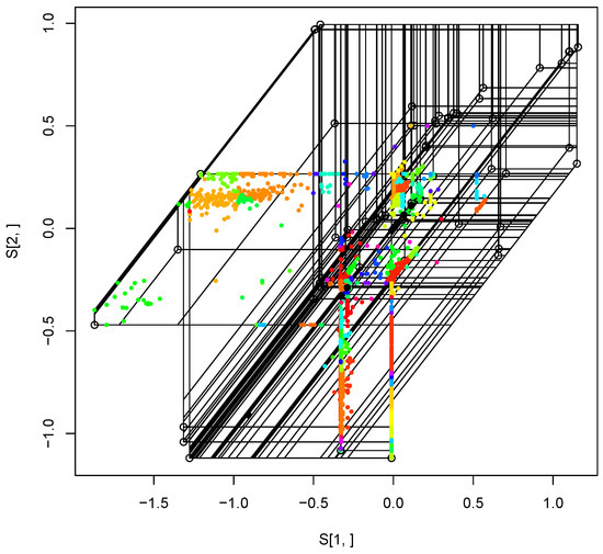 The tropical polytope of gene trees for the housekeeping genes. Black points in the figures are outliers found by the tropical KDE. In order to visualize this, we apply the tropical PCA. Each color represents an unique tree topology.