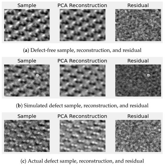 However, if the sample is chosen to contain a defect, a simulated defect is added at a random location. For this model, the simulated defects are circles of three to five pixels in radius, with a gray-scale color value of 0.8 (light gray), but the size, shape, and color of the defects can be changed at will. A PCA reconstruction of the simulated defect sample is then created and subtracted from the simulated defect image. The resulting residual is then added to the training set and labeled as a defect. A sample with a simulated defect, its PCA reconstruction, and the residual can be seen in the middle row of Figure 2. These residual images are what is used to train the CNN.