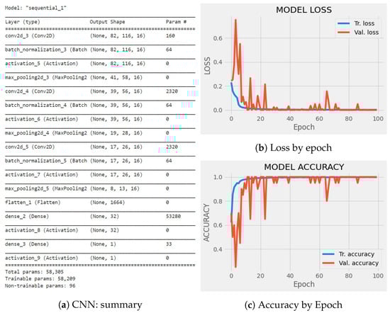The three main pieces are a CNN, PCA, and a data generator. The CNN used is a standard AlexNet CNN [9], which is a type of neural network commonly used for defect detection. A summary of the model can be found in Figure 3a, with loss and accuracy graphs from training in Figure 3b and Figure 3c, respectively. While this style of CNN is commonly used for defect detection tasks, our CNN is trained on an unusual set of data. The samples discussed in the previous section are not directly used in training. Before the samples can be used in training, they go through a process involving a PCA reconstruction.