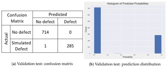 As discussed in Section Testing Data, three tests were performed on the model, with each test using a different data set and checking different things. The first test was a model validation test. Data similar to the training data, that is, data with simulated defects, were fed into the trained model. The purpose of this test was to ensure that the model trained properly. The defect ratio was also lowered for this test set to ensure that it had no impact on model accuracy. As seen in the confusion matrix shown in Figure 6a, the model performed well in this test, predicting only one simulated defect as not a defect. The distribution of the predicted defect probabilities is shown in Figure 6b.