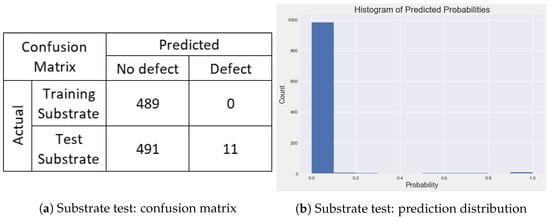 Results of the substrate test. (a) Confusion matrix: The expected result was no defects for both sets. However, it is likely that both “defect free” images had some defects, so the predicted defects could be true defects. No defects were detected in the training substrate image because it was used in training. (b) Distribution of predicted probabilities: A histogram showing the number of samples with the predicted probability of a defect. Probabilities above 0.5 were predicted as defects.