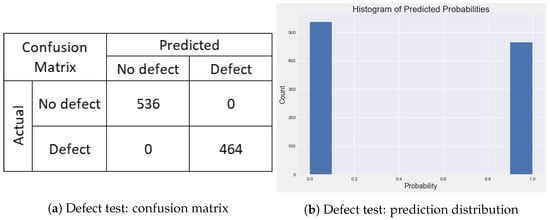 Results of the defect test. (a) Confusion matrix: This test had 100% accuracy, correctly predicting all samples from the defect sample as defects and all samples from the defect-free image as no defects. (b) Distribution of predicted probabilities: A histogram showing the number of samples with the predicted probability of a defect. For this test, all non-defect samples had a predicted probability under 0.1, and all defect samples had a predicted probability above 0.9.