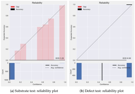 where is the expectation of some random variable X and is a (conditional) probability mass function. In our case, z is the observed class, i.e., defect-free or defected, while is the predicted class. is a probability estimate for the predicted class, and p is the true class probability. With Equation (1), the implication for defect identification in our substrate images is that our estimated probabilities are reflective of the true underlying probabilities of a defect. As an example, we should observe defects, say, in 10% of our observations (“relative frequency”) where we estimate a 10% defect probability. We can assess calibration in practice with the use of metrics like empirical calibration error (ECE) or with the use of reliability plots. We point the interested reader to [10] for more details on these approaches. We include reliability plots for our two test sets in Figure 9.