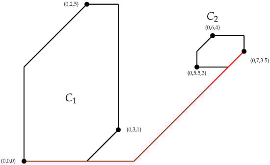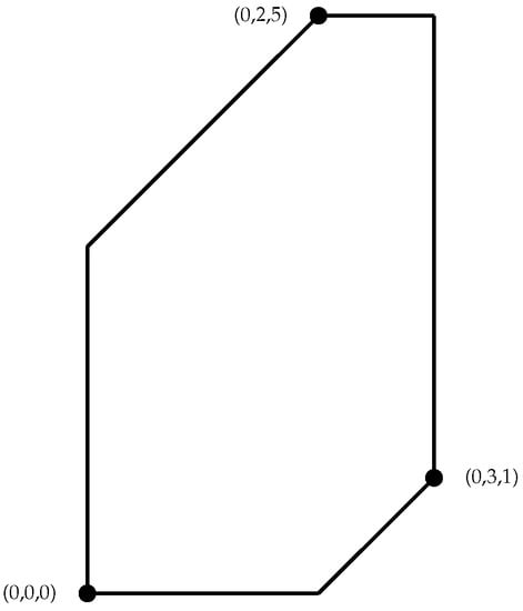 Consider the set of points . By Equation (1), . The tropical polytope defined by these points has a planar representation shown in Figure 1. The black lines between points in Figure 1 represent tropical line segments between each pair of vertices.