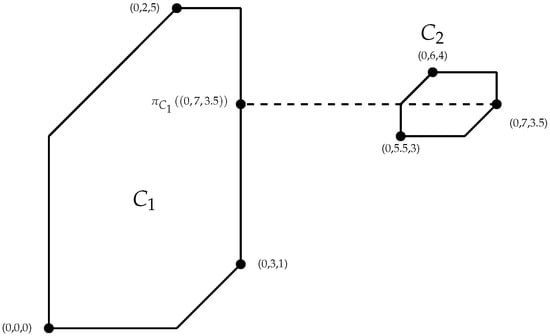 An alternative to pairwise tropical distances between points in different clusters is to calculate the tropical distance between a point in a cluster and its projection onto another cluster. A cluster of points in the tropical projective torus is a tropically convex set that can be defined as a tropical polytope. We denote the tropical polytope defined by the points in cluster as . To determine the dissimilarity between two clusters, and , we can project each point from onto . The projection of a point onto is the point in that is closest in terms of the tropical distance to the point being projected. Calculating the distance between a point and its projection provides the basis of a dissimilarity measure.