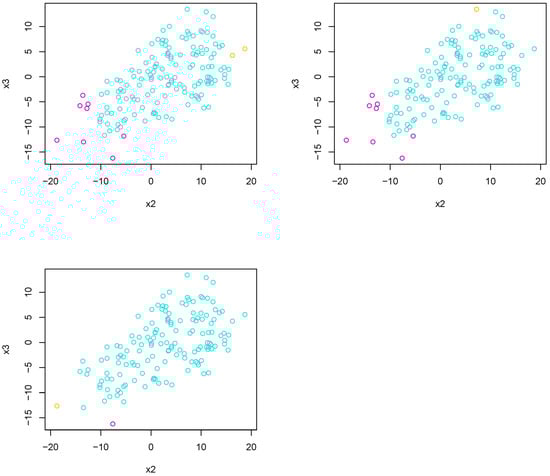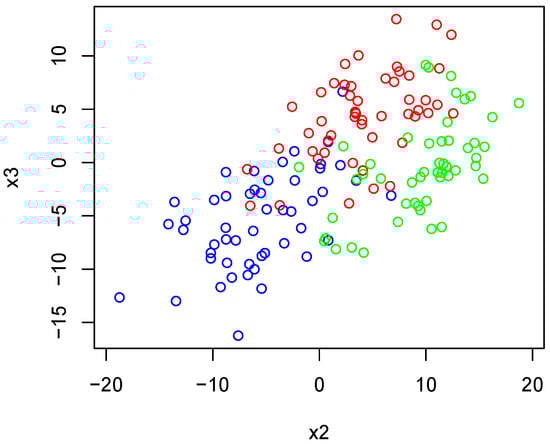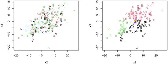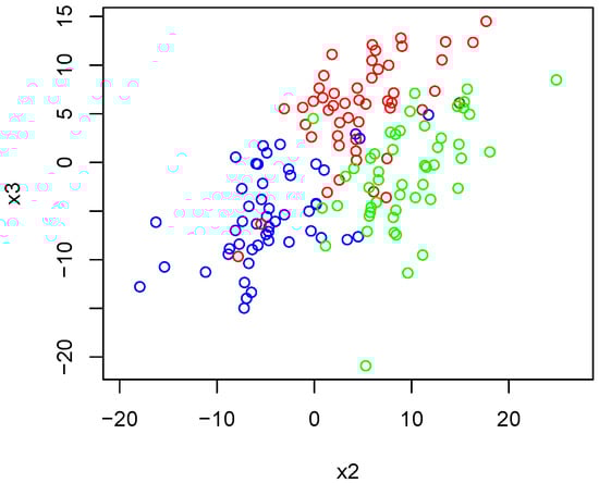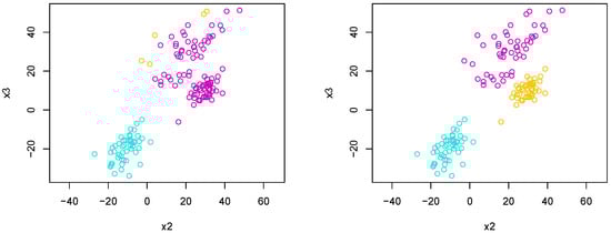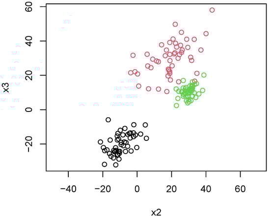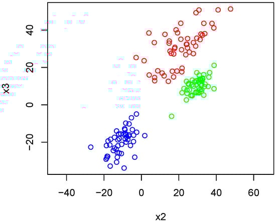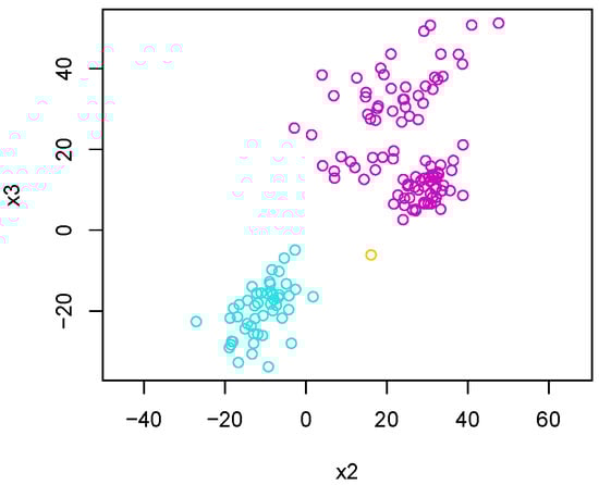In this first experiment, we sample points using the Gaussian-like tropical HAR sampler, where we sample points using the Gaussian-like tropical HAR sampler. In this experiment, 50 points are sampled with and , 50 points are sampled using and , and 50 points are sampled using and . We then apply Algorithm 4 using each of the dissimilarity measures defined in the previous section. Figure 13 shows the sampled points differentiated by color. We see that the groups of the sampled are visually separable. We then apply Algorithm 4 using each of the dissimilarity measures defined in the previous sections. Figure 13 shows the sampled points differentiated by color. We see that the groups of samples are visually separable.