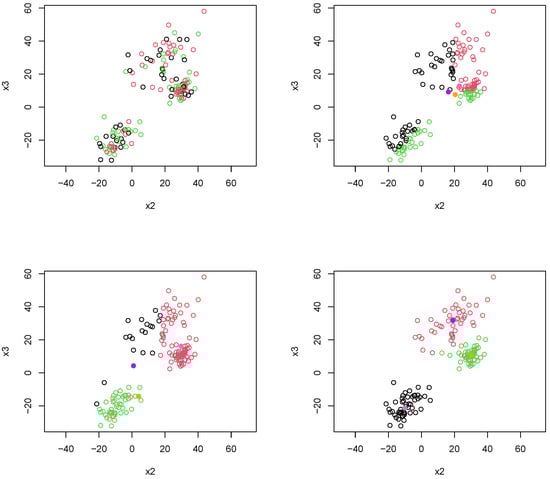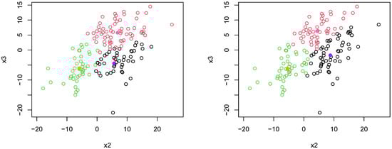 The Fermat–Weber point u, calculated from (6), provides the representation of a centroid based on the tropical metric. For each iteration of Algorithm 2, we recompute a Fermat–Weber point for each cluster as long as observations continue to be reassigned to different clusters. A possible challenge to using the tropical Fermat–Weber point is that the point may not be unique. Therefore, it is conceivable that the cluster membership may not change when it should, or the converse. This bears further research and exploration. For a thorough discussion on tropical Fermat–Weber points, see [13].