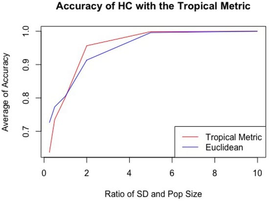 In this computational experiment, we fix , which means . We sample random 20 trees from each sample and we repeat 100 times to estimate the accuracy rates for clustering by different distributions. In Figure 17, we plot the averages of accuracy rates from 100 repeats for each ratio R. We also compare the accuracy rates against DIANA with the Euclidean metric ( norm).