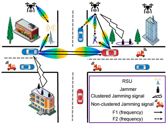 - The U-V2X system employing non-clustered and clustered jamming signals is presented, which faces disturbances owing to fluctuating 3D antenna beam width. Under this system, VNs communicate with adjacent VNs in their vicinity via a V2V connection or with UAVs via a V2U connection, taking into account characteristics such as network conditions, distance, and antenna strength.