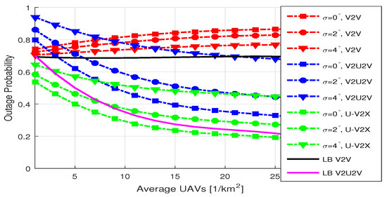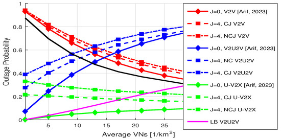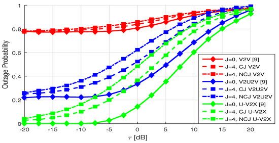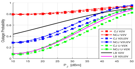 - The work in [9] concentrated on UAV beam-width fluctuations in U-V2X communications and their impact on success probability without considering jamming interference; this study focused on both jamming interference and UAV beam-width fluctuations in U-V2X communications, evaluating their impact on OP. Additionally, this research examined the effects of both non-clustered and clustered jammers on network performance. Furthermore, this work suggests prioritizing the implementation of anti-jamming techniques for non-clustered jammers with a higher probability rather than focusing solely on clustered jammers.