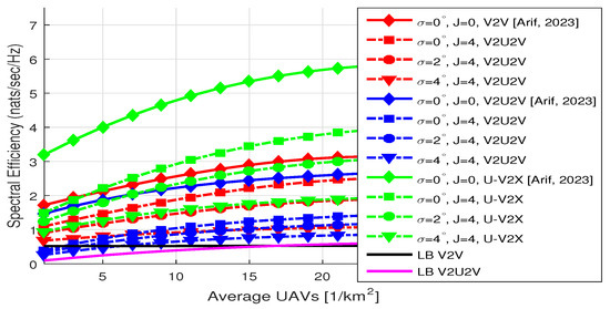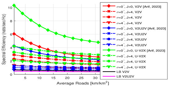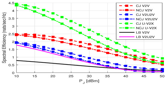 - The analytical equations for the OP of V2V connection, VN to UAV connection (i.e., V2U2V), and U-V2X connection, considering both non-clustered and clustered jammers, are presented. The investigation also evaluates the impact of different setups for system effectiveness concerning OP and SE, such as the jammer’s transmission power, average jammers, average UAVs, average VNs, and average roadways.