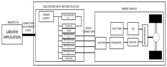 Figure 1 shows the hybrid vehicle architecture with the DAQ system incorporated. To read the CAN Bus messages from the control unit of the vehicle, the hardware components consisted of the Phoenix Contact Industrial Box PC, the Phoenix Contact Quint Power Supply Unit, the Phoenix Contact WLAN 5100, the Vision Systems Net CAN Plus 110, the FL Switch 1000, and the Stilo STB1 Circuit Breaker. Moreover, the Phoenix Contact Wireless Module—FL Timeserver NTP was interconnected together and connected to the car. The host PC was connected to the Phoenix Contact Industrial Box PC remotely via a Local Area Network using an ethernet cable. The LabVIEW software was run on this host PC to read the CAN Messages from the EV through the four (4) Net CAN Plus 110 devices connected to it.