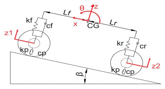 The vehicle dynamics system in this paper is described as half a car, with 3 degrees of freedom (DOF), as shown in Figure 2. The tire dynamics were modeled based on the Pacejka Tire Formula. The vehicle and tire specifications were also adopted from our previous papers [,].