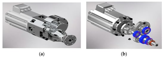 Three-dimensional simulation of the gearbox: (a) enclosed and (b) opened [].