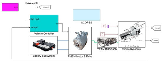 The motor converts electrical energy into mechanical rotational motion, supporting the vehicle’s movement. When the car decelerates, the motor acts as a generator and converts the mechanical energy into electrical energy, thus opposing the vehicle’s motion. A complex PMSM was modeled to estimate the electrical efficiency of the electric vehicle. The electrical losses of the three-phase model were used to simulate the electric car at the system level, which captures the behavior of the complex model as adopted from []. Moreover, the methodology applied for vehicle modeling was adopted from [,]. Table 2 presents the parameters of the three-phase PMSM used in the experimental determination of electrical losses.