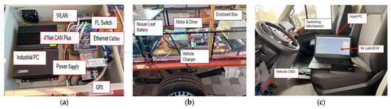 Experimental set-up: (a) the hardware connection of the enclosed box seen on the vehicle; (b) the part of the vehicle containing the electrical part and the hardware connection in the enclosed box for the Net CAN Plus 110; and (c) the laptop connected to the vehicle with NI LabVIEW running for reading the CAN Bus messages.