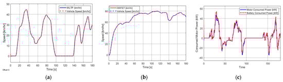 (a) The vehicle speed due to the WLTP cycles test. (b) The vehicle speed due to the highway test profile. (c) The motor and the Nissan Leaf battery power consumed for the hybrid vehicle. The small space between the motor and the battery power indicates a small loss in power transmission from the Nissan Leaf battery to the e-motor.