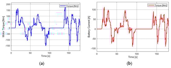 (a) The motor torque originating from the pure e-Crafter. (b) The Nissan Leaf battery current originated from the pure e-Crafter.