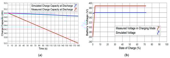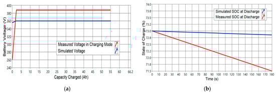 (a) The simulated and measured voltages plotted against the battery capacity in Ah of the battery when the vehicle was in charging mode. (b) The simulated and measured battery state of the charge (SOC) when the car was discharging plotted against the time.