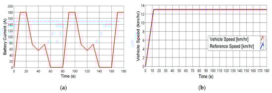 The measured and simulated battery SOC were 71.5% and 72.5% at 180 s, respectively, as shown in Figure 11b. The simulated SOC started at the same initial SOC of the actual vehicle, which was 73%. The same applies to the battery capacity in Figure 12a. In this situation, the vehicle was in discharging mode to compare the simulated and measured results. Moreover, the measured maximum battery current of the Nissan Leaf battery for the car was 180 A, as shown in Figure 13a. A Leaf battery cell can draw up to 90 A, and the total current of the pack is simulated to be 180 A. This showed that our Nissan Leaf battery was drawing its maximum current during the charging mode. During the field test, the vehicle was first tested at 13 km/h, and the PI controller in MATLAB/Simulink software (MATLAB R2021b, MathWorks, Natic, MA, USA) controlled its simulated speed. The result of the test is shown in Figure 13b. The simulation results show an increase in battery consumption since vehicle consumption depends on the battery as the energy source. In the discharging mode, the initial and measured current capacities of the Leaf battery were 55 Ah and 53.5 Ah, respectively. Then, the remaining battery capacity would be 23.34 kWh. Therefore, for the simulation, the initial and final current capacities were 55 Ah and 54.7 Ah, respectively. Then, the remaining energy capacity would be 23.87 kWh. Therefore, for the simulation, the battery stored more energy out of its total energy capacity. With the simulation, through a system identification, the Nissan Leaf battery in our VW Crafter could be improved to over 8 years and range of up to more than 135 km.
