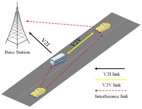 The IoV model is shown in Figure 1 which consists of several cars, a single base station, X V2I links and Y V2V links. To ensure the high quality of the V2I link communication, it is assumed that each V2I link is allocated with different orthogonal frequency spectrum subcarriers in advance to eliminate the interference between different V2I links in the IoV environment using the spectrum sensing technology. We define that each V2I link has a fixed allocation of the subcarrier, and the transmission power of all V2I links is . Since V2V link and V2I link share the same spectrum resources, each V2V link needs to select the specific spectrum and transmission power to improve the communication quality of the V2V link. Therefore, this paper will focus on the design of spectrum resources and power allocation scheme for the V2V link in the IoV to maximize the total transmission rate of the V2I and V2V links.
