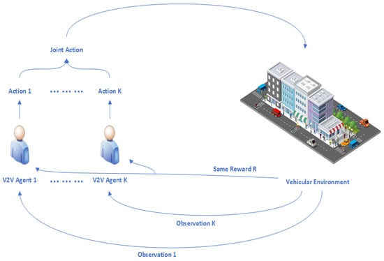 As an agent, each V2V link y explores the unknown vehicular environment in the multi-agent resource allocation scenario [,] and the resource allocation problem can be mathematically seen as an MDP. In Figure 2, given the current state , each V2V agent k obtains an observation function of the environment at each time step t, and then chooses an action to form a joint action . Subsequently, each agent receives the same reward and the vehicular environment enters to the next state with probability . Then, each V2V agent will receive the next observation .