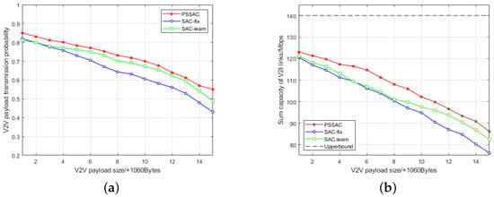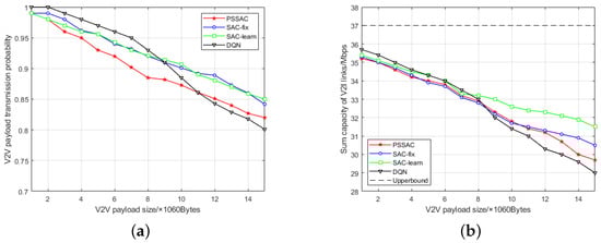 Vehicle number = 10: (a) V2V payload transmission success probability with the varying payload; and (b) sum capacity of V2I links with the varying V2V payload size B.
