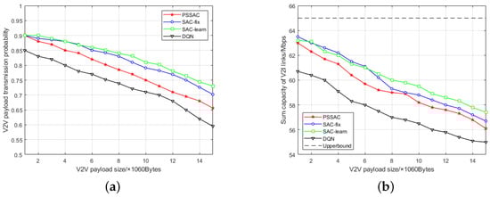 Secondly, the V2V payload transmission success probability and V2I sum capacity of the PSSAC, SAC-fix, SAC-learn, and DQN are compared. When the number of vehicles is 6, the V2I sum capacity and V2V payload transmission success probability of the two SAC algorithms and DQN algorithm are simulated and compared in Figure 6a,b, respectively. This shows that, compared with the SAC algorithm, the V2I sum capacity of the DQN algorithm is better when the size of the loads is small, but the performance obviously decreases with the increase in the size of loads. In addition, the V2I performance of the SAC algorithm is inferior to that of the DQN algorithm, but when the required transmission load increases to 8 × 1060 bytes, the performance of the SAC algorithm begins to exceed that of DQN algorithm, and the performance changes more stably with the increase in loads. In Figure 7a,b, when the vehicle number comes to 10, the advantages of the DQN algorithm are no longer prominent and SAC algorithms always perform better than DQN with the increase in payload size. In addition, when the vehicular environment becomes more complex, such as increasing the payload size and vehicle size, the SAC-learn performs better than others.