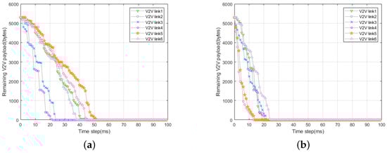 In addition, in order to see how different agents transmit and cooperate in the transmit payload process, we record the remaining payload of each agent. When the number of vehicles is 6, the residual load changes of the V2V link in the SAC-fix algorithm and DQN algorithm are also observed, as shown in Figure 9a,b, respectively. On the one hand, both algorithms complete the load transmission task in a very short time. On the other hand, the DQN algorithm takes about twice the amount of time as the SAC-fix algorithm does and its stability is worse than the SAC-fix algorithm. Because the adoption of the maximum entropy idea of the SAC algorithm makes the agent randomize the action as much as possible—on the basis of completing the current task—to obtain a variety of approximate optimal choices, this improves the agent’s exploration ability in the environment and improves the stability of SAC algorithm in the dynamic environment.