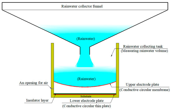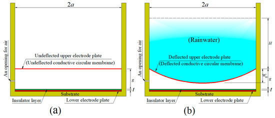On the other hand, after application of the collected rainwater, as shown in Figure 11b, the conductive circular membrane (the upper electrode plate) is in a deflected state, whose spatial geometry is governed by the deflection solution: , see Equations (17) and (25). Therefore, at this time, the capacitor between the upper electrode plate and the insulator layer is changed from the original parallel plate capacitor with the capacitance C1 to the current, non-parallel plate capacitor with the capacitance