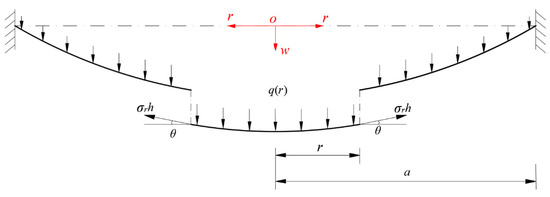 Suppose that an initially flat, conductive, circular membrane with radius a, thickness h, Poisson’s ratio ν, and Young’s modulus of elasticity E is fixed peripherally at the inner wall of the rainwater-collecting tank, as shown in Figure 1, and then it is deflected toward the insulator layer due to the action of the collected rainwater in the rainwater-collecting tank; that is, the action of the so-called liquid weight loading, denoted by q(r), where the height of the rainwater above the plane in which the initially flat, peripherally fixed, conductive, circular membrane is located is denoted by H. A free body is taken from the central portion of the deflected circular membrane in Figure 1, whose radius is 0 ≤ r ≤ a, to study its static problem of equilibrium, as shown in Figure 2, where the origin, o, of the introduced cylindrical coordinate system (r, φ, w) is placed in the centroid of the initially flat circular membrane. The dash-dotted line represents the geometric middle plane of the initially flat circular membrane in which the polar coordinate plane (r, φ) is located, r, φ, and w are the radial, circumferential, and transverse coordinates, respectively, w also denotes the transverse displacement of the deflected circular membrane under the action of the loads, q(r), σr denotes the radial stress, and θ denotes the slope angle at a point on the geometric middle plane of the deflected circular membrane.