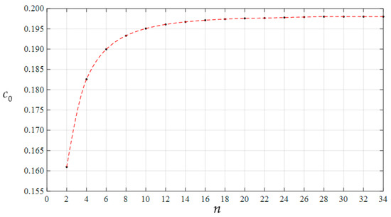 Variation of c0 with n when a = 70 mm, h = 0.3 mm, E = 3.05 MPa, ν = 0.45, and H = 1000 mm.