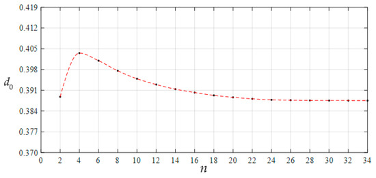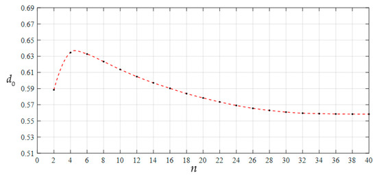 Variation of d0 with n when a = 70 mm, h = 0.3 mm, E = 3.05 MPa, ν = 0.45, and H = 1000 mm.