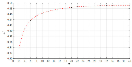 Variation of c0 with n when a = 70 mm, h = 0.3 mm, E = 3.05 MPa, ν = 0.45, and H = 300 mm.